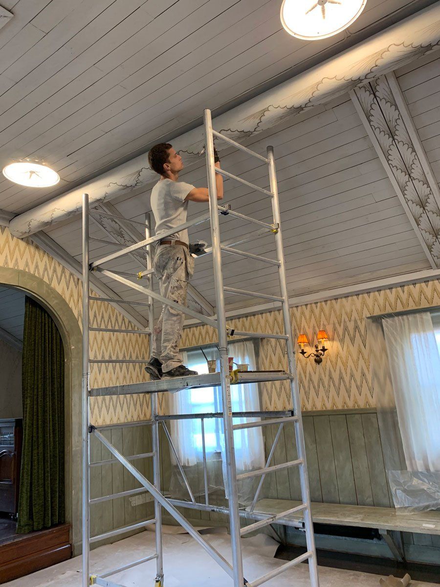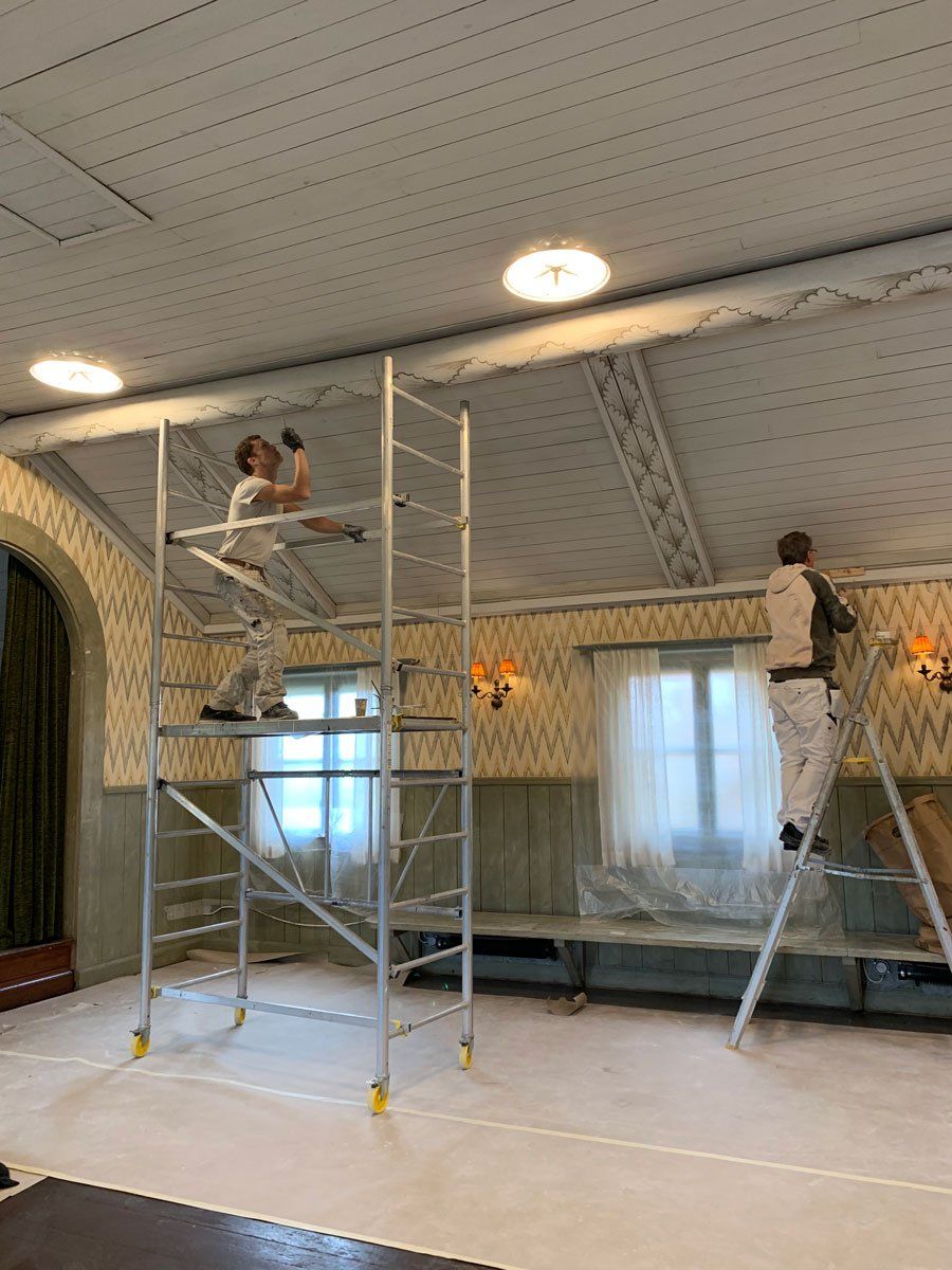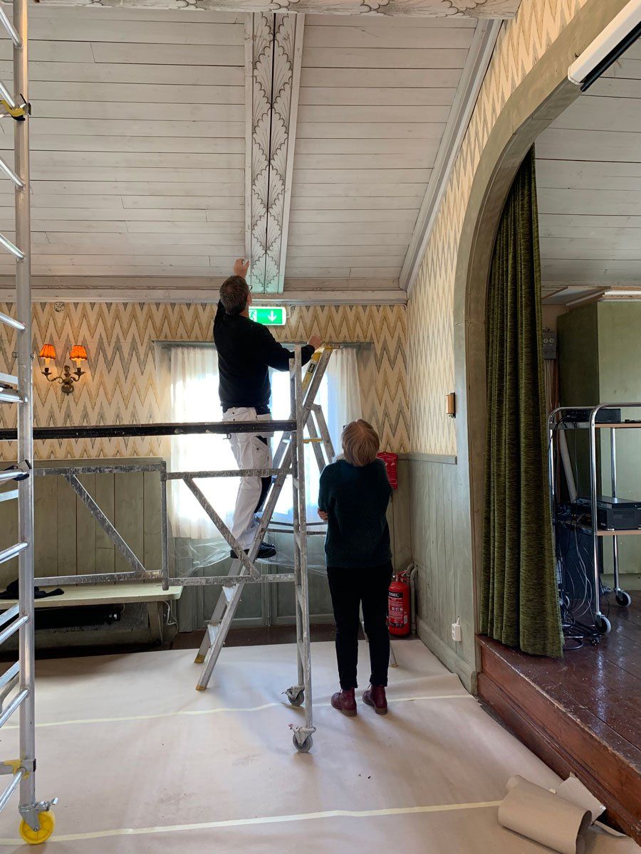- Renovering av de handmålade väggarna i stora salen som tvättas och alla skador lagas med ny färg.